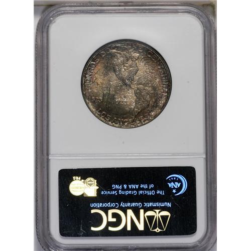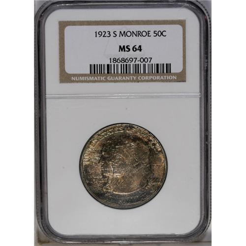<B>1923-S<50C> Monroe MS64 NGC.</B></I> A satiny and deeply toned near-Gem whose gold and brown surfaces exhibit few marks. Some striking weakness on the conjoined busts partly defines the grade.