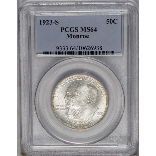 <B>1923-S<50C> Monroe MS64 PCGS.</B></I> Bright luster and mere traces of light patina adorn the otherwise creamy-white surfaces. Typically struck with a few wispy marks on the obverse. Very near to Gem quality.