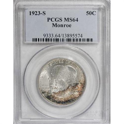 <B>1923-S 50C Monroe MS64 PCGS.</B></I> PCGS Population (1319/367). NGC Census: (1402/336). Mintage: 274,077. Numismedia Wsl. Price for NGC/PCGS coin in MS64: $400. (#9333)<BR><I>From The Frank DuVall Collection of U.S. Commemoratives.</B></I><BR><BR><b>Shipping:</b> Coins & Currency (<a target="_blank" href="http://www.heritageauctions.com/common/shipping.php">view shipping information</a>\)