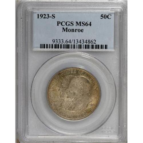 <B>1923-S 50C Monroe MS64 PCGS.</B></I> PCGS Population (1353/373). NGC Census: (1409/339). Mintage: 274,077. Numismedia Wsl. Price for NGC/PCGS coin in MS64: $400. (#9333)<BR><BR><b>Shipping:</b> Coins & Currency (<a target="_blank" href="http://www.heritageauctions.com/common/shipping.php">view shipping information</a>)