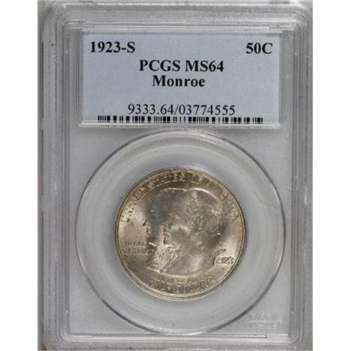 <B>1923-S 50C Monroe MS64 PCGS.</B></I> PCGS Population (1378/376). NGC Census: (1409/339). Mintage: 274,077. Numismedia Wsl. Price for NGC/PCGS coin in MS64: $400. (#9333)<BR><BR><b>Shipping:</b> Coins & Currency (<a target="_blank" href="http://www.heritageauctions.com/common/shipping.php">view shipping information</a>)