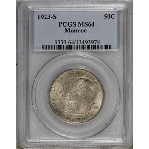 <B>1923-S 50C Monroe MS64 PCGS.</B></I> . PCGS Population (1422/389). NGC Census: (1427/347). Mintage: 274,077. Numismedia Wsl. Price for NGC/PCGS coin in MS64: $380. (#9333)<BR><BR><b>Shipping:</b> Coins & Currency (<a target="_blank" href="http://www.heritageauctions.com/common/shipping.php">view shipping information</a>)