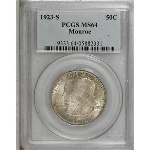 <B>1923-S 50C Monroe MS64 PCGS.</B></I> PCGS Population (1430/393). NGC Census: (1424/347). Mintage: 274,077. Numismedia Wsl. Price for NGC/PCGS coin in MS64: $380. (#9333)<BR><BR><b>Shipping:</b> Coins & Currency (<a target="_blank" href="http://www.heritageauctions.com/common/shipping.php">view shipping information</a>)