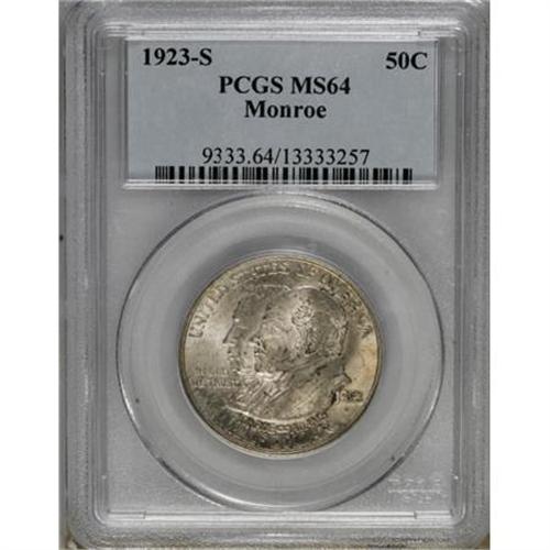 <B>1923-S 50C Monroe MS64 PCGS.</B></I> PCGS Population (1431/393). NGC Census: (1426/347). Mintage: 274,077. Numismedia Wsl. Price for NGC/PCGS coin in MS64: $380. (#9333)<BR><BR><b>Shipping:</b> Coins & Currency (<a target="_blank" href="http://www.heritageauctions.com/common/shipping.php">view shipping information</a>)