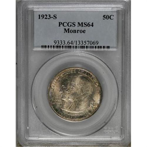 <B>1923-S 50C Monroe MS64 PCGS.</B></I> PCGS Population (1431/393). NGC Census: (1426/347). Mintage: 274,077. Numismedia Wsl. Price for NGC/PCGS coin in MS64: $380. (#9333)<BR><BR><b>Shipping:</b> Coins & Currency (<a target="_blank" href="http://www.heritageauctions.com/common/shipping.php">view shipping information</a>)
