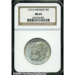 <B>1923-S 50C Monroe MS65 NGC.</B></I> As commemorative collectors know, the Monroe is one of the scarcest Halves to locate in Gem condition. This is an especially clean and lustrous example, the obverse is covered with hints of golden-gray patina while the reverse is nearly brilliant.
