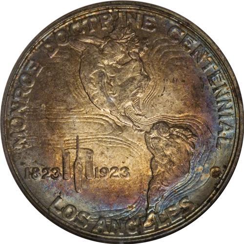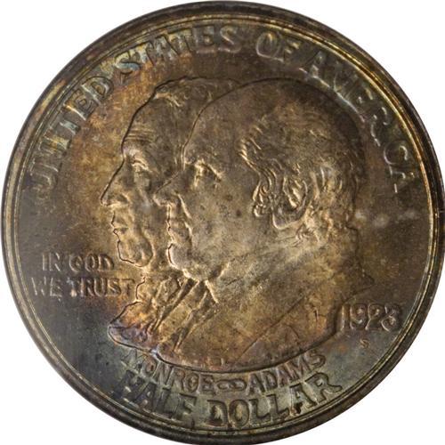 1923-S 50C Monroe MS65 NGC. Lavish aquamarine, golden-