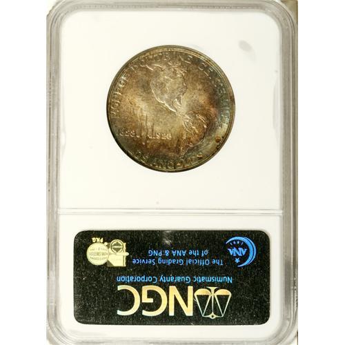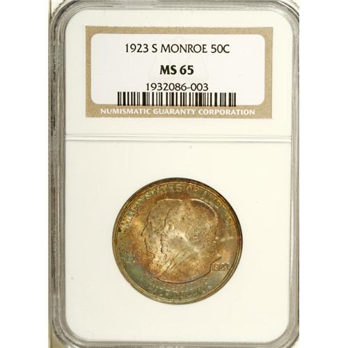 <B>1923-S 50C Monroe MS65 NGC.</B></I> Lavish aquamarine, golden-brown, and purple iridescence adorns each side of this originally preserved Gem. Typically boldly struck and highly lustrous, with a few faint blemishes that are largely concealed by the deep patina. Struck to commemorate the Centennial year of the Monroe Doctrine.<BR><BR><b>Shipping:</b> Coin/Currency (<a target="_blank" href="http://www.heritageauctions.com/common/shipping.php">view shipping information</a>)