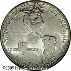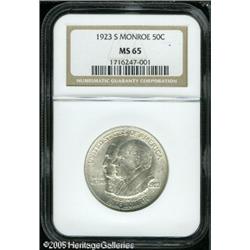 <B>1923-S 50C Monroe MS65 NGC.</B></I> One of the great condition rarities in the series of commemorative half dollars, the Monroe was struck in lower relief and thus subject to abrasions. This is a brilliant example that has exceptionally attractive mint frost and minimal abrasions. Population: 249 in 65, 51 finer (1/05).<BR><I>From The Banks Collection.</B></I> Lot:8534