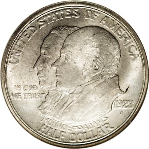 <B>1923-S 50C Monroe MS65 NGC.</B></I> One of the most difficult of all commemorative issues in Gem condition, this pristine, original Monroe exhibits all the qualities one looks for in a high quality specimen. The surfaces are sharper than the normal low relief example and display shimmering luster under a layer of silver-gray patina.