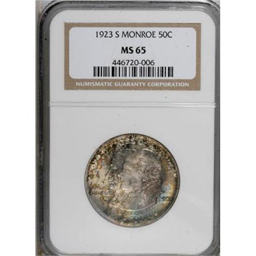 <B>1923-S 50C Monroe MS65 NGC.</B></I> Splashes of gold, yellow, ocean-blue, and lime-green intermingle with gray-lavender coloration. This attractively toned piece is crisply struck for the type, and has only faint contact on Monroe's cheek.<BR><I></B></I><BR><BR><b>Shipping:</b> Coins & Currency (<a target="_blank" href="http://www.heritageauctions.com/common/shipping.php">view shipping information</a>)