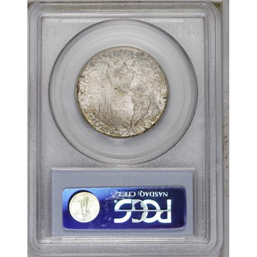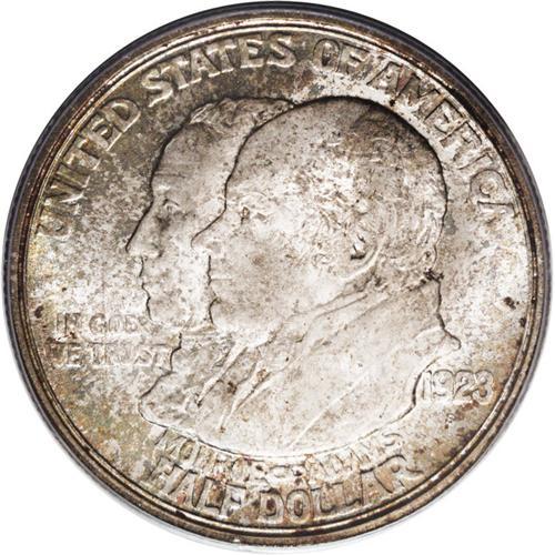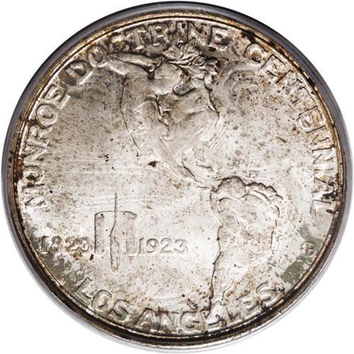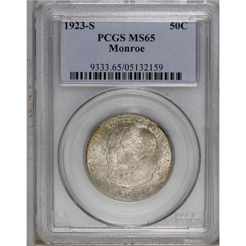 <B>1923-S<50C> Monroe MS65 PCGS.</B></I> A famous condition rarity in the silver commemorative series, Monroes are usually seen with numerous small marks peppering the main devices. This piece is exceptionally clean with excellent mint luster and speckled sea-green, tan, and russet patina over both sides. A highly attractive example.