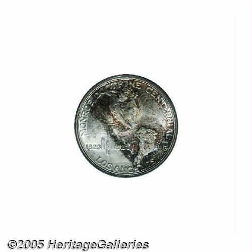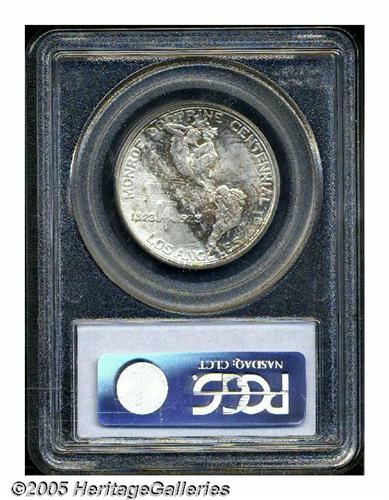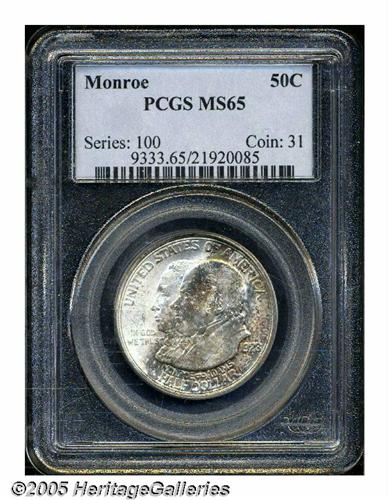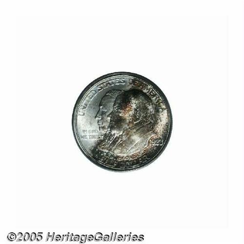 <B>1923-S<50C> Monroe MS65 PCGS.</B></I> Bright and lustrous throughout, with a streak of rainbow toning on both the obverse and reverse. Scattered ticks from an even higher grade, and far nicer than average for the colorful hues. A scarce issue to obtain in Gem grades.