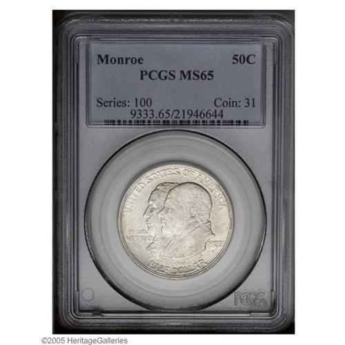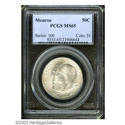 1923-S 50C Monroe MS65 PCGS. Bright, very well struck 1923-S[50C] Monroe MS65 PCGS.