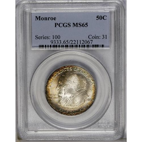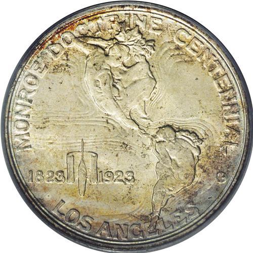 1923-S 50C Monroe MS65 PCGS. Lovely peach-gold, lime,