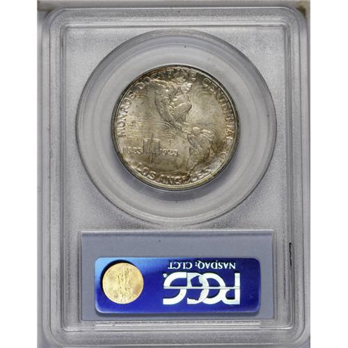 <B>1923-S<50C> Monroe MS65 PCGS.</B></I> Lovely peach-gold, lime, and ice-blue toning endows this lustrous and nicely struck Gem. Thorough evaluation locates a few wispy field grazes, but these do not affect the obvious eye appeal. Technically a mint error, since a thin and inconspicuous lamination is concealed within Adams' hair.