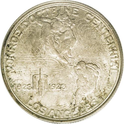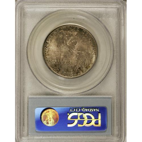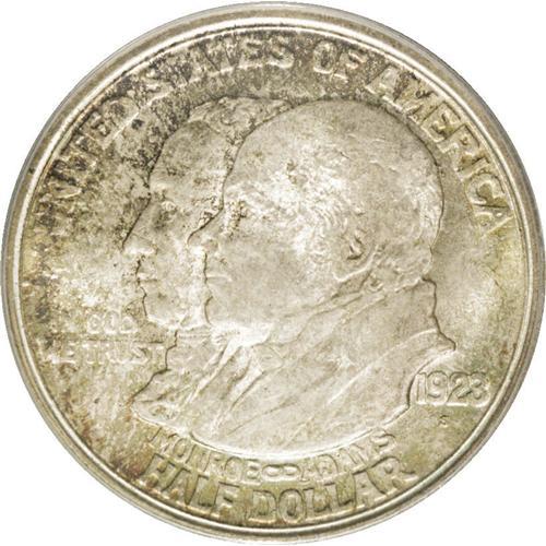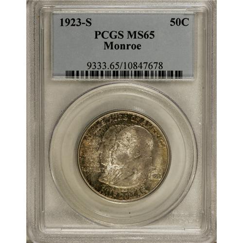 <B>1923-S 50C Monroe MS65 PCGS.</B></I> The dies for this issue were engraved to a shallow depth, meaning that a little strike weakness created considerable design weakness on the finished coin. This example has an excellent strike, and the frosty surfaces are hidden beneath violet-gray, pale gold, and iridescent toning.<BR><BR><b>Shipping:</b> Coin/Currency (<a target="_blank" href="http://www.heritageauctions.com/common/shipping.php">view shipping information</a>)