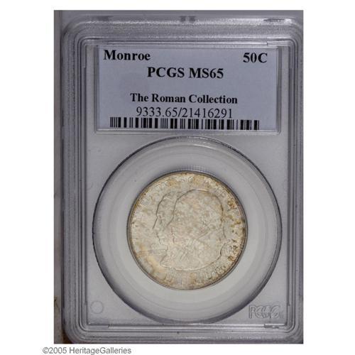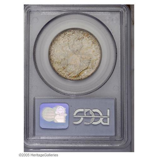 <B>1923-S<50C> Monroe MS65 PCGS.</B></I> The otherwise silver tinged surfaces exhibit dappled sprays of olive, gold and orange-russet highlights toward the rims. Fulsome mint frost blankets both sides and highlights the uncommonly distraction-free features. Attractive in all regards.
