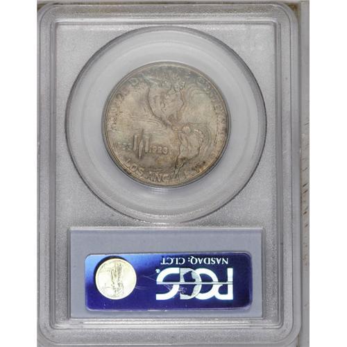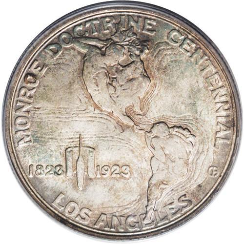 <B>1923-S<50C> Monroe MS65 PCGS.</B></I> The overall quality and appeal of this Monroe commemorative half seems distinctly better than usual, for the issue. While the reverse details are typically soft, the obverse portraits are sharper than average. Satin luster illuminates well preserved, distraction-free surfaces, and the two sides of the piece display variegated aqua, rose-gray, and coral toning. An impressive Gem.