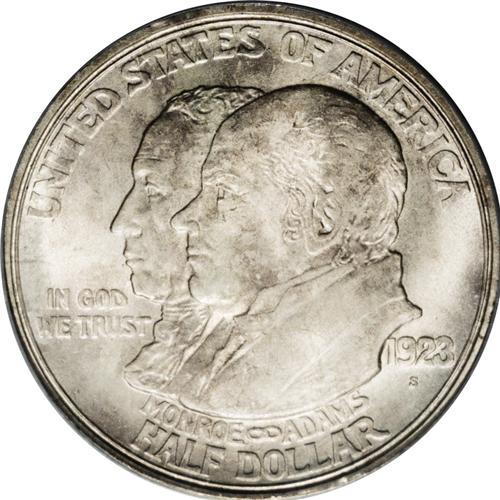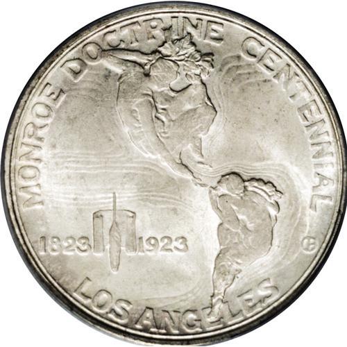 <B>1923-S<50C> Monroe MS65 PCGS.</B></I> Very well struck for this notoriously substandard issue, with dappled lilac-gray patina seen predominately on the obverse. The combination of poor production standards and heavy distribution among non-collectors has always made the Monroe Doctrine Centennial Half a difficult issue as a Gem.