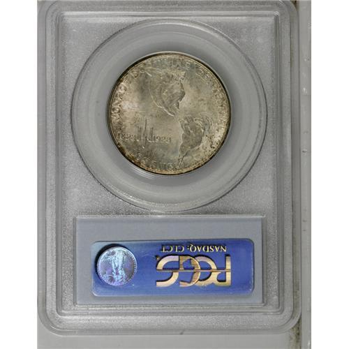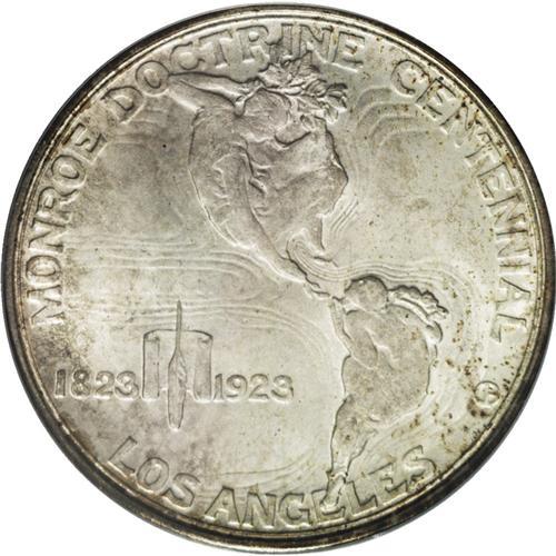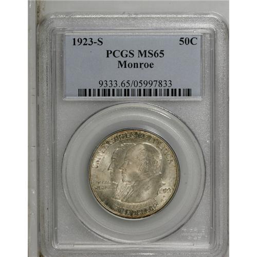 <B>1923-S 50C Monroe MS65 PCGS.</B></I> While many individuals the world over decry media they see as corrupt or immoral, few of them would associate those qualities with the silent films of the early 1920s and before. Yet even then, Hollywood was known for tawdriness and scandal, and the commemorative coins that ostensibly commemorated the centennial of the Monroe Doctrine were actually linked to a Los Angeles exposition designed to rehabilitate the reputation of the movie industry. The present example is an elusive Gem, well-preserved with the usual strike and luster. Reddish-gold patina covers much of the piece, and a few small marks to the left of the busts are the only notable flaws.<BR><BR><b>Shipping:</b> Coin/Currency (<a target="_blank" href="http://www.heritageauctions.com/common/shipping.php">view shipping information</a>)
