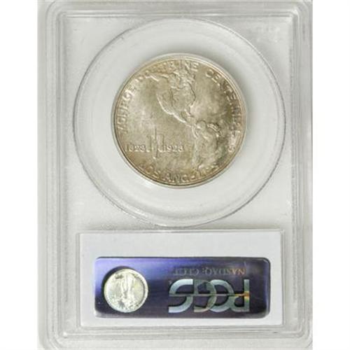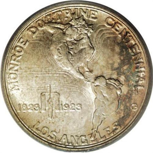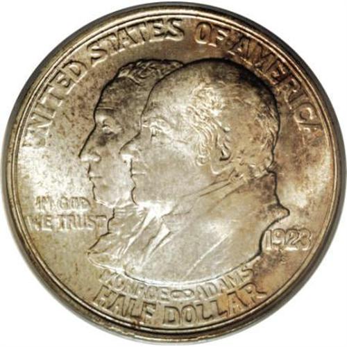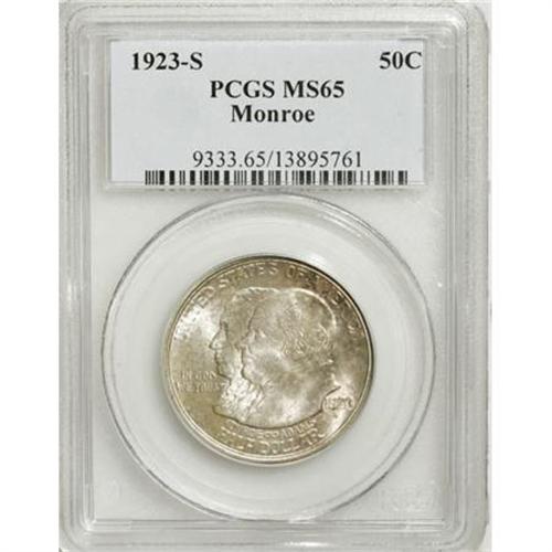 <B>1923-S 50C Monroe MS65 PCGS.</B></I> Perhaps the most famous conditionally elusive classic commemorative, the Monroe half, while available and comparatively inexpensive through the Choice grade, becomes much more difficult to acquire and expensive as a Gem. This example, well-defined for the grade with strong luster, has dappled silver-gray and tan color to the left with orange and forest-green patina to the right.<BR><I>From The Frank DuVall Collection of U.S. Commemoratives.</B></I><BR><BR><b>Shipping:</b> Coins & Currency (<a target="_blank" href="http://www.heritageauctions.com/common/shipping.php">view shipping information</a>\)