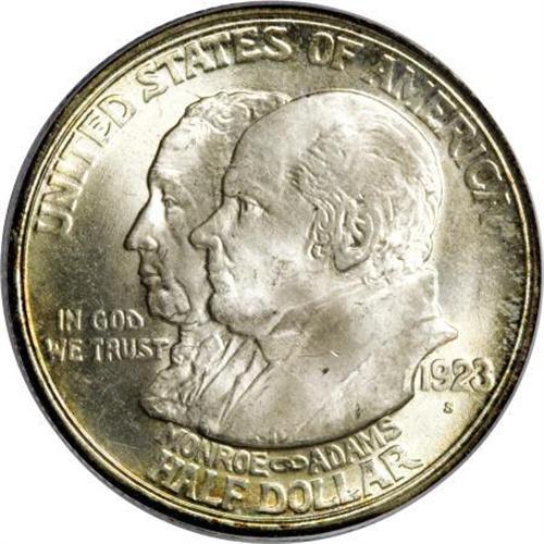 <B>1923-S 50C Monroe MS65 PCGS.</B></I> A surprisingly attractive example of the Monroe half dollar, an issue that some have suggested never comes nice. This piece is brilliant in the centers with frosty and highly lustrous silver-white surfaces. The surfaces are surprisingly well-preserved for the grade assigned, and each side exhibits faint peripheral toning.<BR><BR><b>Shipping:</b> Coins & Currency (<a target="_blank" href="http://www.heritageauctions.com/common/shipping.php">view shipping information</a>)