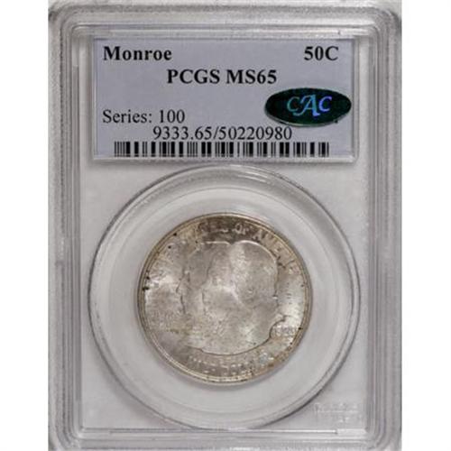 <B>1923-S 50C Monroe MS65 PCGS. CAC.</B></I> Splashes of straw-gold and powder-blue enrich this vivaciously lustrous Gem. Pinpoint russet freckles congregate beneath the conjoined busts. A few faint grazes are of little consequence.<BR><I>From The Southwest Collection.</B></I><BR><BR><b>Shipping:</b> Coins & Currency (<a target="_blank" href="http://www.heritageauctions.com/common/shipping.php">view shipping information</a>)