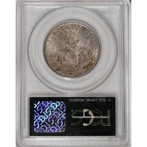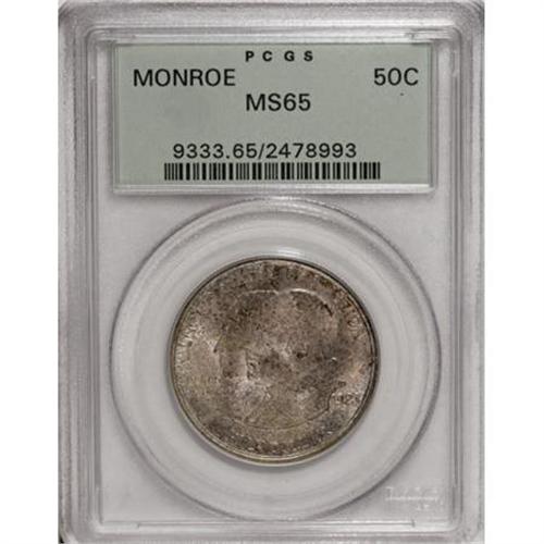 <B>1923-S 50C Monroe MS65 PCGS.</B></I> This shimmering Gem has magnificently variegated forest-green and cream-gray toning. The obverse is well preserved, and although the reverse has faint marks, they are concealed by the deep original patina. In a green label holder.<BR><BR><b>Shipping:</b> Coins & Currency (<a target="_blank" href="http://www.heritageauctions.com/common/shipping.php">view shipping information</a>)