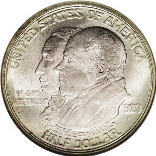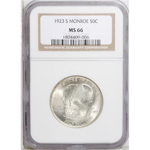 <B>1923-S<50C> Monroe MS66 NGC.</B></I> For the commemorative specialist who seeks the finest available quality, this is an important opportunity. Both sides of this magnificent Gem have brilliant silver surfaces and frosty luster. Traces of pale lilac-gold color can be seen at the lower reverse, but there is no other visible toning. This is a remarkable piece with few peers and even fewer higher quality examples. Census: 45 in 66, 7 finer (9/06).