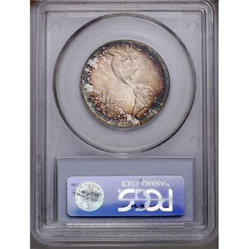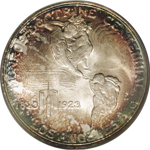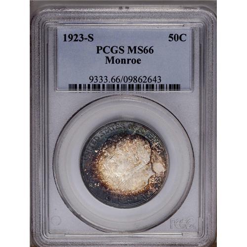 <B>1923-S<50C> Monroe MS66 PCGS.</B></I> Gorgeous apple-green and golden-brown bands frame the lightly toned centers of this lustrous Premium Gem. Boldly struck for the type, which always shows some incompleteness of detail on the hair above Adams' ear. The Monroe Doctrine commemorative was sponsored by the motion picture industry. A large mintage of 274,000 pieces ensures that the issue will never be rare in typical Mint State grades, but the low relief design, Adams' broad cheek, and the open reverse field combine to limit high grade examples.