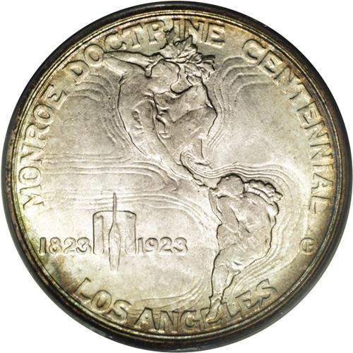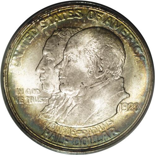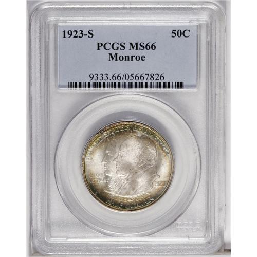 <B>1923-S<50C> Monroe MS66 PCGS.</B></I> Monroe halves are now considered a condition rarity in the commemorative series. Pieces approaching Gem condition are quite available; however, in loftier grades, the situation changes dramatically. In MS66, the Monroe is exceptionally difficult to locate, with less than a dozen known finer. The luster on this piece is simply outstanding, being thick and frosted. Both sides show deep peripheral rings of reddish-russet and aqua-blue colors with much underlying brilliance still in evidence. The surfaces are exceedingly lustrous and only lightly marked, as one would expect for the grade. Population: 46 in 66, 4 finer (9/06).