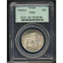 <table><tr><td><TABLE cellSpacing=0 cellPadding=0 width="100%" bgColor=#000000 border=0><TBODY> <TR><TD width="100%"><TABLE cellSpacing=1 cellPadding=3 width="100%" border=0><TBODY><TR><TD width="100%" bgColor=#79735c><FONT face=arial color=#ffffff size=3><B>Description</B> </FONT></TD></TR><TR><TD width="100%" bgColor=#ffffff><FONT face=arial size=2><B>1923-S 50C Monroe MS66 PCGS.</B></I> The virtually flawless surfaces are thickly frosted and both sides are covered with deep, variegated golden and blue toning and speckled russet coloration around the right portion of the obverse. Little can be said here that hasn't been said before about what a major condition rarity the Monroe is in MS65 and better grades. The population figures say it all: 38 in 66, 4 finer (10/03). </FONT></TD></TR></TBODY></TABLE></TD></TR></TBODY></TABLE><BR><A name=PricesRealized></A><TABLE cellSpacing=0 cellPadding=0 width="100%" bgColor=#000000 border=0><TBODY><TR><TD width="100%"><TABLE cellSpacing=1 cellPadding=3 width="100%" border=0><TBODY><TR><TD width="100%" bgColor=#79735c><A name=PR><FONT face=arial color=#ffffff size=3><B>Previous Prices from Heritage Auctions</B> </FONT></A></TD></TR><TR><TD bgColor=#f6f6ed><TABLE cellSpacing=0 cellPadding=0 width="100%" border=1><TBODY><TR><TD align=middle width="33%"><B>Date</B></TD><TD align=middle width="33%"><B>Service</B></TD><TD align=middle width="33%"><B>Price</B></TD></TR><TR bgColor=whitesmoke><TD width="33%"><B>05/03/2003</B></TD><TD width="33%">NGC</TD><TD width="33%">$4,025.00</TD></TR><TR bgColor=whitesmoke><TD width="33%"><B>03/24/2003</B></TD><TD width="33%">NGC</TD><TD width="33%">$3,565.00</TD></TR><TR bgColor=whitesmoke><TD width="33%"><B>01/11/2003</B></TD><TD width="33%">PCGS</TD><TD width="33%">$2,817.50</TD></TR><TR bgColor=whitesmoke><TD width="33%"><B>04/28/2002</B></TD><TD width="33%">PCGS</TD><TD width="33%">$4,140.00</TD></TR><TR bgColor=whitesmoke><TD width="33%"><B>01/12/2002</B></TD><TD width="33%">PCGS</TD><TD width="33%">$8,855.00</TD></TR><TR bgColor=whitesmoke><TD width="33%"><B>11/15/2001</B></TD><TD width="33%">PCGS</TD><TD width="33%">$6,612.50</TD></TR><TR bgColor=whitesmoke><TD width="33%"><B>08/08/2001</B></TD><TD width="33%">PCGS</TD><TD width="33%">$4,025.00</TD></TR><TR bgColor=whitesmoke><TD width="33%"><B>04/05/2001</B></TD><TD width="33%">NGC</TD><TD width="33%">$4,025.00</TD></TR><TR bgColor=whitesmoke><TD width="33%"><B>08/13/1999</B></TD><TD width="33%">NGC</TD><TD width="33%">$4,830.00</TD></TR><TR bgColor=whitesmoke><TD width="33%"><B>09/23/1998</B></TD><TD width="33%">NGC</TD><TD width="33%">$3,080.00</TD></TR><TR bgColor=whitesmoke><TD width="33%"><B>07/30/1994</B></TD><TD width="33%">PCGS</TD><TD width="33%">$4,840.00</TD></TR></TBODY></TABLE></TD></TR><TR><TD bgColor=#ffffff><FONT face=arial size=1 ?>PLEASE NOTE: All prices realized reflect the final hammer price PLUS the buyer's premium in auctions that charge a buyer's premium. Each item has a notation at the top of the listing indicating whether that lot included a buyer's premium. Example: A item that sells with a final hammer price of $100 and a 20% buyer's premium will display with a price realized of $120. All information listed is intended to be as accurate as possible, but errors are possible. Please use this guide carefully and inform us of any inaccuracies. </FONT></TD></TR></TBODY></TABLE></TD></TR></TBODY></TABLE><BR><TABLE cellSpacing=0 cellPadding=0 width="100%" bgColor=#000000 border=0><TBODY><TR><TD width="100%"><TABLE cellSpacing=1 cellPadding=3 width="100%" border=0><TBODY><TR><TD width="100%" bgColor=#79735c colSpan=6><FONT face=arial color=#ffffff size=3><B>Price Guide*</B> </FONT></TD></TR><TR bgColor=#f6f6ed><TD align=middle><B>Grade</B> </TD><TD align=middle><B>Coin World<BR>(Trends)</B> </TD><TD align=middle><B>Numismedia<BR>Retail</B> </TD><TD align=middle><B>Numismedia<BR>Wholesale</B> </TD><TD align=middle><B>Coin<BR>Universe</B> </TD><TD align=middle><B>Heritage<BR>Value Index</B> </TD></TR><TR bgColor=#ffffff><TD align=middle>65</TD><TD align=right>$3,500.00</TD><TD align=right>---</TD><TD align=right>$1,825.00</TD><TD align=right>$3,750.00</TD><TD align=right>$2,128.63</TD></TR><TR style="FONT-WEIGHT: bold" bgColor=#cccfdd><TD align=middle>66</TD><TD align=right>$6,500.00</TD><TD align=right>---</TD><TD align=right>$4,450.00</TD><TD align=right>$7,250.00</TD><TD align=right>$4,537.50</TD></TR><TR bgColor=#ffffff><TD align=middle>67</TD><TD align=right>$9,000.00</TD><TD align=right>---</TD><TD align=right>$10,500.00</TD><TD align=right>$15,000.00</TD><TD align=right>$8,400.00</TD></TR><TR bgColor=#ffffff><TD colSpan=6><FONT size=1>*All information listed is intended to be as accurate as possible, but errors are possible. No item may be returned or refused based on this information which is provided as a service to our customers. You should contact each pricing source directly to determine the accuracy of this information. </FONT></TD></TR></TBODY></TABLE></TD></TR></TBODY></TABLE><BR><TABLE cellSpacing=0 cellPadding=0 width="100%" bgColor=#000000 border=0><TBODY><TR><TD width="100%"><TABLE cellSpacing=1 cellPadding=3 width="100%" border=0><TBODY><TR><TD width="100%" bgColor=#79735c><FONT face=arial color=#ffffff size=3><B>Population Guide</B> </FONT></TD></TR><TR bgColor=#ffffff><TD align=middle><!-- Begin Output of Population Grid--><TABLE cellSpacing=0 cellPadding=0 width="100%" border=0><TBODY><TR><TD vAlign=center><TABLE cellSpacing=0 width="100%" border=1 cellsadding="3"><TBODY><TR><TD vAlign=center><TABLE cellSpacing=0 cellPadding=3 width="100%" border=1><TBODY><TR><TD vAlign=center align=middle bgColor=#f0f1e8 colSpan=2 <CENTER><FONT face=Arial size=2><B>PCGS Pop </B></FONT><CENTER></CENTER></TD><TD vAlign=center align=middle bgColor=#f0f1e8 colSpan=2><CENTER><FONT face=Arial size=2><B>NGC Pop</B></CENTER></FONT></TD></TR><TR><TD vAlign=center><FONT face=Arial size=2>(66)</FONT> </TD><TD vAlign=center align=right><FONT face=A