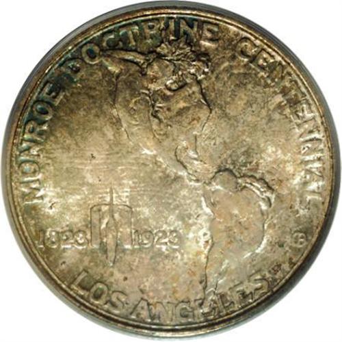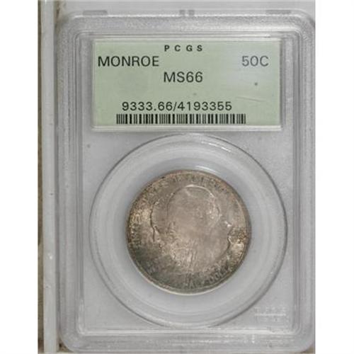 <B>1923-S 50C Monroe MS66 PCGS.</B></I> The shallow relief, mass-distributed Monroe half dollar, long overlooked by silver commemorative collectors, has correctly emerged as a formidable condition rarity in the series. This lovely Premium Gem example is certainly in the upper echelon among Mint State survivors. Silky-smooth, wholly original surfaces are toned in lovely violet and sea-green shades. Population: 46 in 66, 4 finer (7/07).<BR><BR><b>Shipping:</b> Coins & Currency (<a target="_blank" href="http://www.heritageauctions.com/common/shipping.php">view shipping information</a>\)