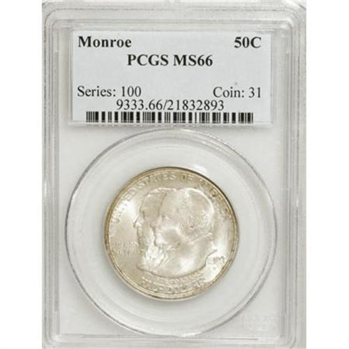 <B>1923-S 50C Monroe MS66 PCGS.</B></I> Potent luster and original pearl-gray toning proclaim the eye appeal of this moderately abraded representative. The Monroe Doctrine half dollar has a substantial mintage for a silver commemorative, but much of the production was released into circulation. In fact, PCGS has certified two examples as Poor 1. Population: 46 in 66, 4 finer (8/07).<BR><I>From The Sterling Collection.</B></I><BR><BR><b>Shipping:</b> Coins & Currency (<a target="_blank" href="http://www.heritageauctions.com/common/shipping.php">view shipping information</a>)