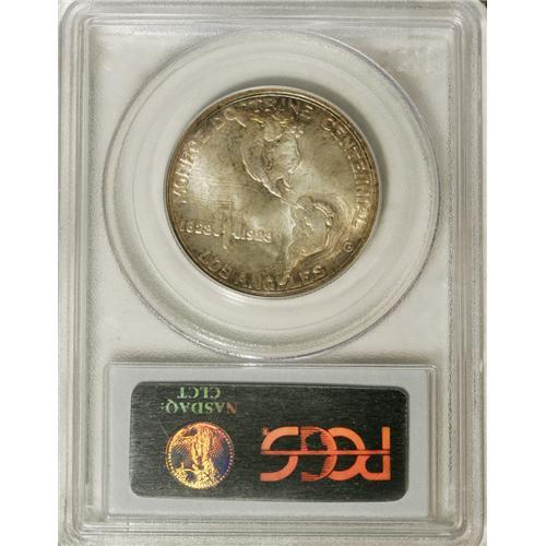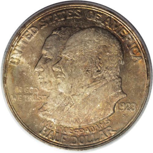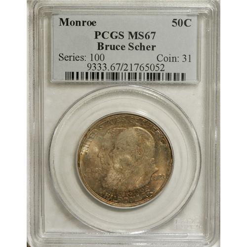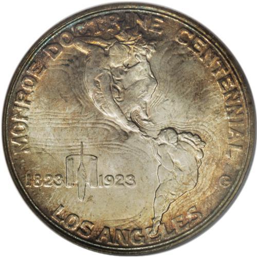 <B>1923-S 50C Monroe MS67 PCGS.</B></I> Ex: Bruce Scher. Long before the controversial films of the 1950s and 1960s, or even "talkies" (<I>The Jazz Singer</B></I> was released in 1927), American actors and directors alike had developed unsavory reputations, and multiple deaths in the early 1920s only heightened public perception of Hollywood as a modern-day Sodom or Gomorrah. Congress authorized the 1923 commemorative issue that was a tie-in to a public relations exhibition, largely blinded by the ostensible celebration of the Monroe Doctrine centenary, an "anniversary of convenience" for the filmmakers.<BR> Unlike the vast majority of Monroes, hardly any mentionable marks appear on either side of this attractive example. The obverse possesses gorgeous shades of golden-rose, lilac, and emerald, while the reverse is brilliant in the center with a ring of delicate golden-brown patina at the margins. This coin's powerful luster shines brightly, even on the richly toned obverse. A magnificent representative. Population: 4 in 67, 0 finer (3/07).<BR><I>From The Cary & Cheryl Porter Collection.</B></I><BR><BR><b>Shipping:</b> Coins & Currency (<a target="_blank" href="http://www.heritageauctions.com/common/shipping.php">view shipping information</a>)