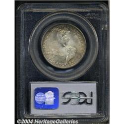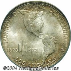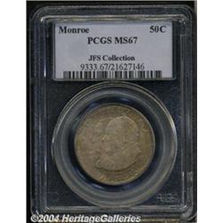 <B>1923-S<50C> Monroe MS67 PCGS.</B></I> In 1923 Hollywood scandals shocked the nation when Fatty Arbuckle was involved in a lurid orgy and murder, and director William Desmond Taylor died under mysterious circumstances. Studio heads began to search for means by which they could raise the public's regard for movies, stars, and directors. They hit upon the idea of sponsoring a centennial celebration honoring the Monroe Doctrine. An exposition was held in one of the stadiums in the Los Angeles area, and commemorative coins were struck. The Monroe Doctrine Centennial Half Dollar was struck in shallow relief and, despite a plentiful mintage, it has become one of the premier condition rarities in the entire commemorative series. It is very elusive in Gem condition and this extraordinary coin is one of the finest available. While not technically perfect, the surfaces are as free from abrasions as any Monroe we have seen with no singularly mentionable marks on either side. The obverse is toned in deep shadings of golden, rose, lilac, and sea-green. The reverse is brilliant in the center with a ring of light golden-brown patina around the rim. Superb luster is seen throughout and is abundantly clear even on the toned obverse. Population: 4 in 67, 0 finer (3/04).<BR><I>Ex: FUN Signature Sale (Heritage, 1/03), lot 9725, which realized $16,100.</B></I><BR><I>From the JFS Collection, the #1 All-Time PCGS Registry Set.</B></I> <BR><BR><B>Important notice:</B> Heritage usually auctions material at the rate of 200-250 lots per hour. On some occasions eBay Live bid software or the Internet may not be able to keep up with the pace of the auction. We recommend placing a realistic absentee bid now as insurance to avoid disappointment. Occasionally the auctioneer may eliminate or reject an eBay Live bid, and the auctioneer may also reopen a lot after the close of the eBay live bidding (usually because we missed an audience bid), and may reject your bid even if it shows you as the winning bidder. By bidding via eBay Live, you agree that Heritage may award the lot to another bidder at its sole discretion under the circumstances described above or any other reasonable circumstances. Since eBay bids are not shown to us until we open the lot on the floor, we treat those bids just like floor bids. In most cases the floor responds before the eBay bid is presented to us, due to Internet lag time, so for consistency we have made it a policy that floor bids are always considered first over tie eBay live bids. Also please note that all Heritage lots purchased through eBay Live carry a 20% Buyer's Premium. Please make sure you read the Terms and Conditions before you bid. </span></font></tr></table></td></tr></table>