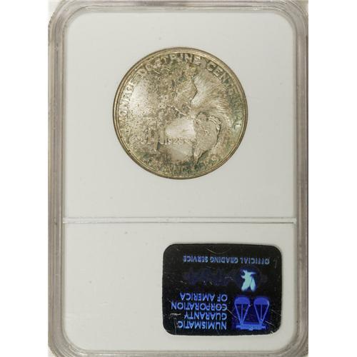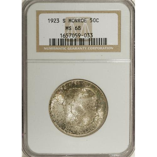<B>1923-S 50C Monroe MS68 NGC.</B></I> In the early 1920s, the phrase "Sin City" conjured up Hollywood, not Las Vegas, and the Motion Picture Industry Exposition of 1923 was created to help rehabilitate the reputation of the silver screen and its stars. The bill authorizing the coinage became law, though it also inspired a film-worthy line from Senator Frank Greene of Vermont that was reproduced in Bowers: "It seems to me that the question is not one of selling a coin at a particular value or a particular place. The question is whether the United States government is going to go on from year to year submitting its coinage to this--well--harlotry."<BR> Between the low-relief design, poor sales that resulted in many examples going into circulation, and mishandling by those who paid a premium for their pieces at the Exposition, the difficulty of finding a well-preserved and pleasing Monroe half is well-documented, and attractive examples have received just recognition. When Heritage last offered this singular example in May 2004, the cataloger wrote: "The luster is richly frosted, and the otherwise silver-white surfaces display mottled olive-orange and steel-blue shadings. This is a coin of singular beauty and unimpeachable technical merits." At the time, this was the <I>only</B></I> Monroe so graded by either NGC or PCGS, and the intervening years have not changed its status (3/07).<BR><I>From The Cary & Cheryl Porter Collection.</B></I><BR><BR><b>Shipping:</b> Coins & Currency (<a target="_blank" href="http://www.heritageauctions.com/common/shipping.php">view shipping information</a>)
