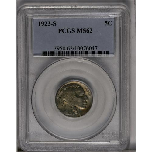 <B>1923-S<5C> MS62 PCGS.</B></I> Typically struck with olive color noted near the borders, and essentially unabraded fields. The luster of the coin is somewhat subdued.