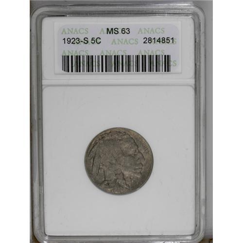 <B>1923-S 5C MS63 ANACS.</B></I> A deep layer of olive-gray toning blankets each side of this carefully preserved example. A pair of small die chips (as struck) reside just beneath the Indian's chin. Somewhat softly struck, but free of even small abrasions, this piece seems conservatively graded at MS63.