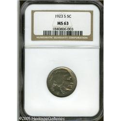 <B>1923-S 5C MS63 NGC.</B></I> Light nickel-gray color with touches of champagne and ice-blue. The strike is somewhat mushy, especially on the reverse, which is typical for the issue. A moderate planchet flake is noted on the bison's head. Lot:5989