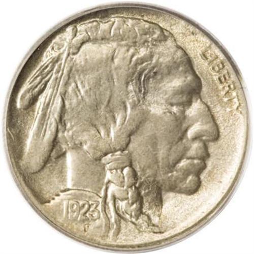 <B>1923-S 5C MS63 PCGS.</B></I> Well struck with quicksilver luster beneath luminous steel-gray patina that shows blue and gold accents at the margins. Lightly flawed on the portrait, yet appealing. According to David Lange, this date is readily available to collectors in grades up to Gem, although the reverse details are typically weak due to die wear. <BR><BR><B>Coin Engraver:</B> James E. Fraser<BR><BR><b>Shipping:</b> Coins & Currency (<a target="_blank" href="http://www.heritageauctions.com/common/shipping.php">view shipping information</a>)