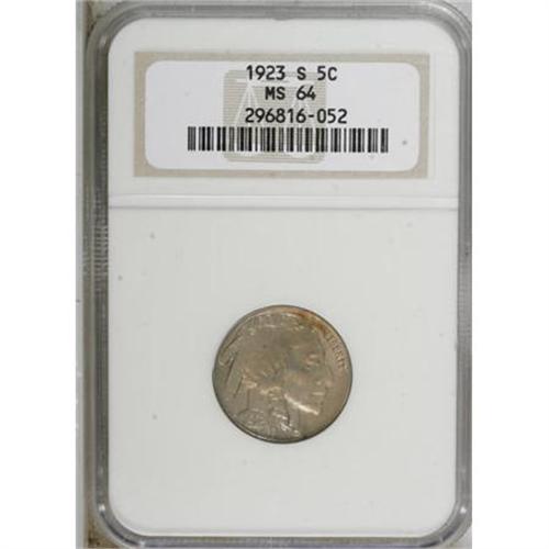 <B>1923-S 5C MS64 NGC.</B></I> Dusky golden-gray toning resides on the lustrous, well preserved surfaces of this near-Gem. Despite some minor softness in the hair over the bison's forehead, the design elements are generally well brought up. <BR><BR><B>Coin Engraver:</B> James E. Fraser<BR><BR><b>Shipping:</b> Coins & Currency (<a target="_blank" href="http://www.heritageauctions.com/common/shipping.php">view shipping information</a>)