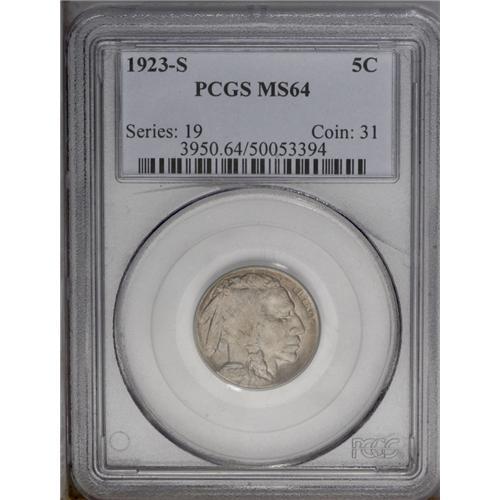 <B>1923-S<5C> MS64 PCGS.</B></I> Both sides have even slate-gray coloration with a touch of rose in the protected portions of each side. The strike is average, but the surfaces have few abrasions for the grade. A scarce coin in Choice Uncirculated despite having a mintage of over six million pieces. <BR><BR><B>Important notice:</B> Heritage usually auctions material at the rate of 200-250 lots per hour. On some occasions eBay Live bid software or the Internet may not be able to keep up with the pace of the auction. We recommend placing a realistic absentee bid now as insurance to avoid disappointment. Occasionally the auctioneer may eliminate or reject an eBay Live bid, and the auctioneer may also reopen a lot after the close of the eBay live bidding (usually because we missed an audience bid), and may reject your bid even if it shows you as the winning bidder. By bidding via eBay Live, you agree that Heritage may award the lot to another bidder at its sole discretion under the circumstances described above or any other reasonable circumstances. Since eBay bids are not shown to us until we open the lot on the floor, we treat those bids just like floor bids. In most cases the floor responds before the eBay bid is presented to us, due to Internet lag time, so for consistency we have made it a policy that floor bids are always considered first over tie eBay live bids. Also please note that all Heritage lots purchased through eBay Live carry a 20% Buyer's Premium. Please make sure you read the Terms and Conditions before you bid. This lot is being auctioned in conjunction with a live floor auction by Heritage Galleries & Auctioneers. All final auction and invoice information will be supplied by Heritage Galleries & Auctioneers, and all other information should be considered preliminary. Lot:1074 <BR><BR><B>Winning Notification and Billing:</B> After the FINAL session in this auction is complete, Heritage will send e-mail and snail mail invoices. This process normally takes several days. All final auction and invoice information will be supplied by Heritage Galleries & Auctioneers, and all other information should be considered preliminary. <BR><BR>This auction will be conducted on a live auction floor and over the Internet through eBay Live. If you choose to place an absentee bid, please take a moment to <font color='#0000ff'><u><a href='http://pages.ebay.com/liveauctions/help/before/laabsentee.html'>learn how eBay Live absentee bidding works</a></u></font><font color='#000000'>