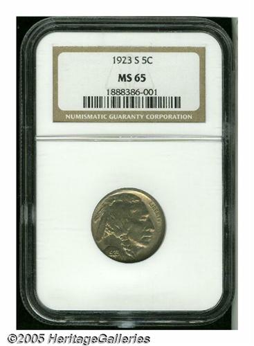 <B>1923-S<5C> MS65 NGC.</B></I> This Gem '23-S displays a much better strike than is characteristic of the issue - the date and LIBERTY are bold, and most of the bison's hair is strong. Lustrous surfaces portray a steel-gray appearance, and are seemingly devoid of significant marks. An excellent candidate for a better-grade Mint State Buffalo nickel collection. Population: 22 in 65, 3 finer (6/05).