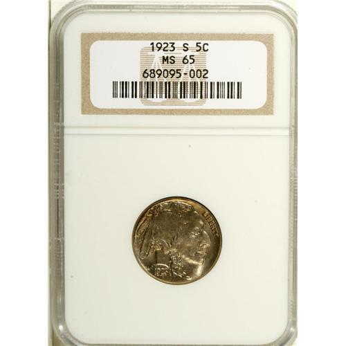 <B>1923-S 5C MS65 NGC.</B></I> This splendid key-date example is more sharply struck than usual. Minimal radial flow lines in the fields indicate that this was struck from a median die state, which makes it all the more remarkable that this piece is so well-defined. The light-gray surfaces are highly lustrous, with light hints of gold, lilac, and mint-green. This is an exceptional coin from an issue that is difficult to locate in Gem condition. Census: 23 in 65, 3 finer (12/06).<BR><BR><b>Shipping:</b> Coin/Currency (<a target="_blank" href="http://www.heritageauctions.com/common/shipping.php">view shipping information</a>)