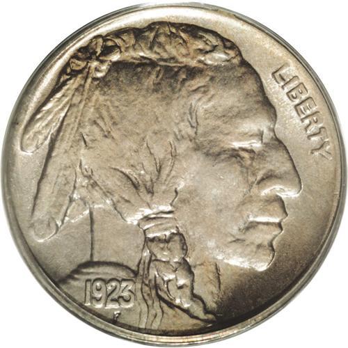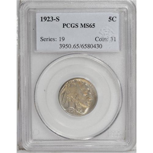 <B>1923-S<5C> MS65 PCGS.</B></I> The 1923-S is one of the great strike and condition rarities in the Buffalo nickel series. Only 26 other Gems have been certified by PCGS with two finer (6/06). As David Lange points out, "Examples having adequate strikes do turn up, but fully struck pieces are rare." The dies were somewhat mismatched that struck this coin as the obverse displays pinpoint striking definition, while the reverse is just a shade less than complete. The surfaces are defect-free and the bright, satiny mint luster is covered with a thin layer of equally bright reddish-gold and ice-blue patina that shows a soft undertone of lilac. An exceptionally pleasing 1923-S nickel.