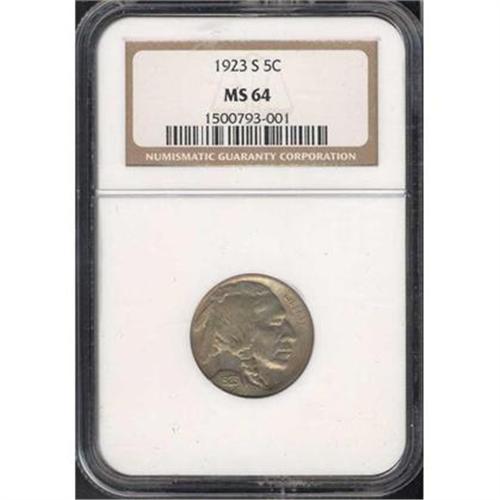 <b>1923-S Buffalo Nickel. NGC graded MS64.</b> A coin with a nice cartwheel appeal, lightly toned surfaces appearing very choice, almost as fresh as when first struck. The dies stamped this coin with systematic exactness throughout excepting the usual weak areas in the center such as the hair near the Indian's braid and the shoulder of the buffalo. A very scarce S-mint coinage <b>(PCGS # 3950)</b> <i>