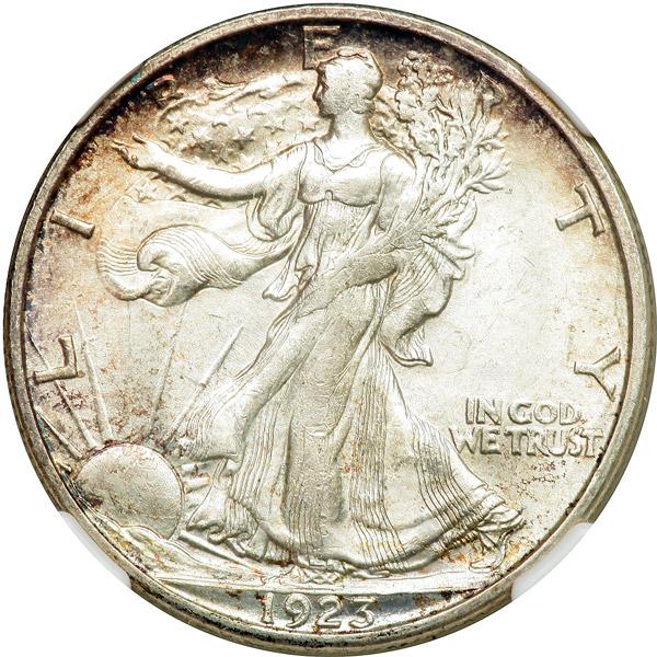1923-S Liberty Walking Half Dollar. NGC graded MS-63. Frosty with light gold toning. Satin fields rippling with luster. The more matte designs stand out nicely against this finish. No toning outside the periphery, just silver-white color.