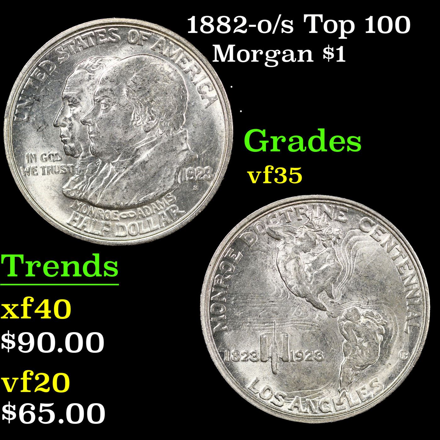 1923-S Monroe Old Commem Half Dollar 50c Grades Choice Unc. One may think that the Reverse of the Two Continents of The Western Hemisphere but upon closer examination you will see that they are two women bent into the general shapes of the two continents. When examining a Monroe Commemorative the cheeks of the two statesmen on the obverse and the figures that represent the two continents on the reverse are the highpoints and will show wear first.